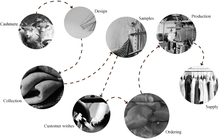 Our strength? Thinking backwards, planning forwards. From the in-store presentation for the photoshoot, to bespoke pattern design, manufacturing, and transforming yarn into wool. We hold all the threads together. Coordinating all our partners, to control the entire workflow.